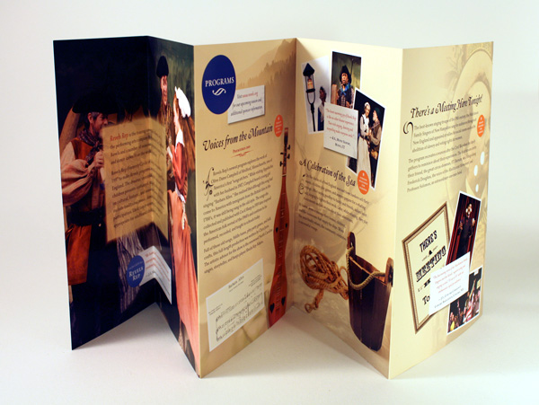 A brochure that describes the shows of a traveling performace group, Revels Rep. Focuses on the historical aspect that each show illustrates.
